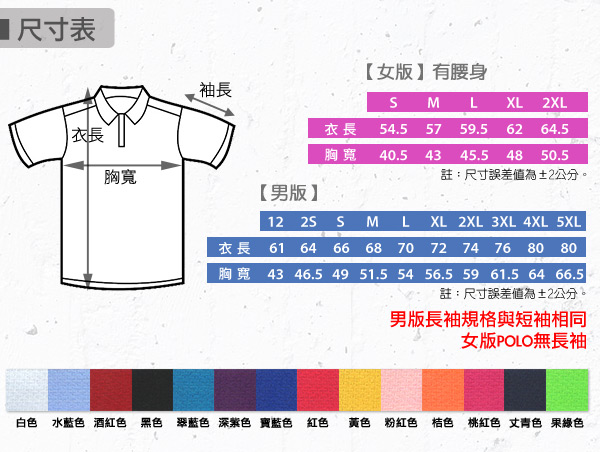 白色/黑色/紅色/黃色/橘色/果綠色/水藍色/翠藍色/寶藍色/藏青色/粉紅色/桃紅色/酒紅色/深紫色